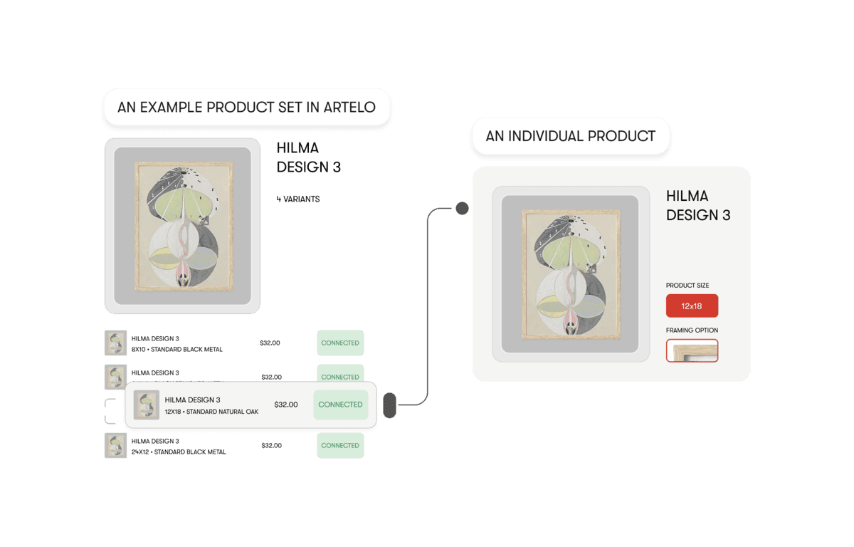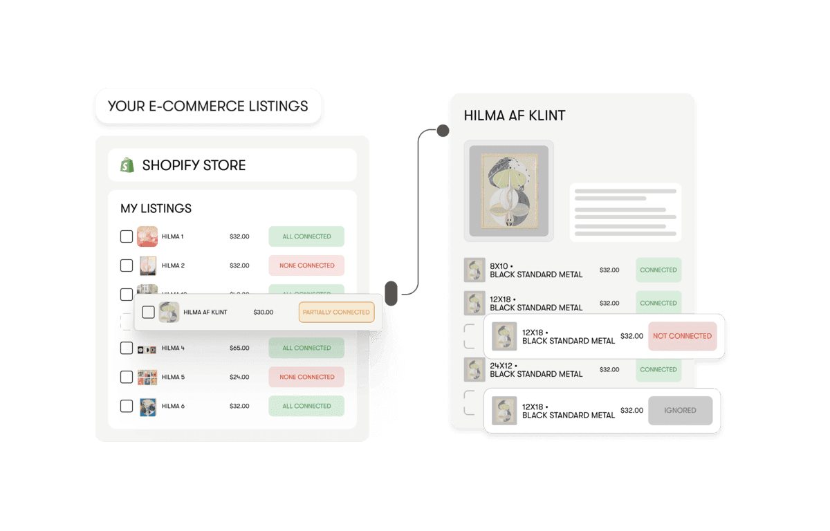 When you connect your store, Artelo imports your listings and assigns each variant an unconnected, connected, or ignored status. Connected variants are linked to Artelo products for automatic fulfillment, while we won’t fulfill unconnected or ignored variants.