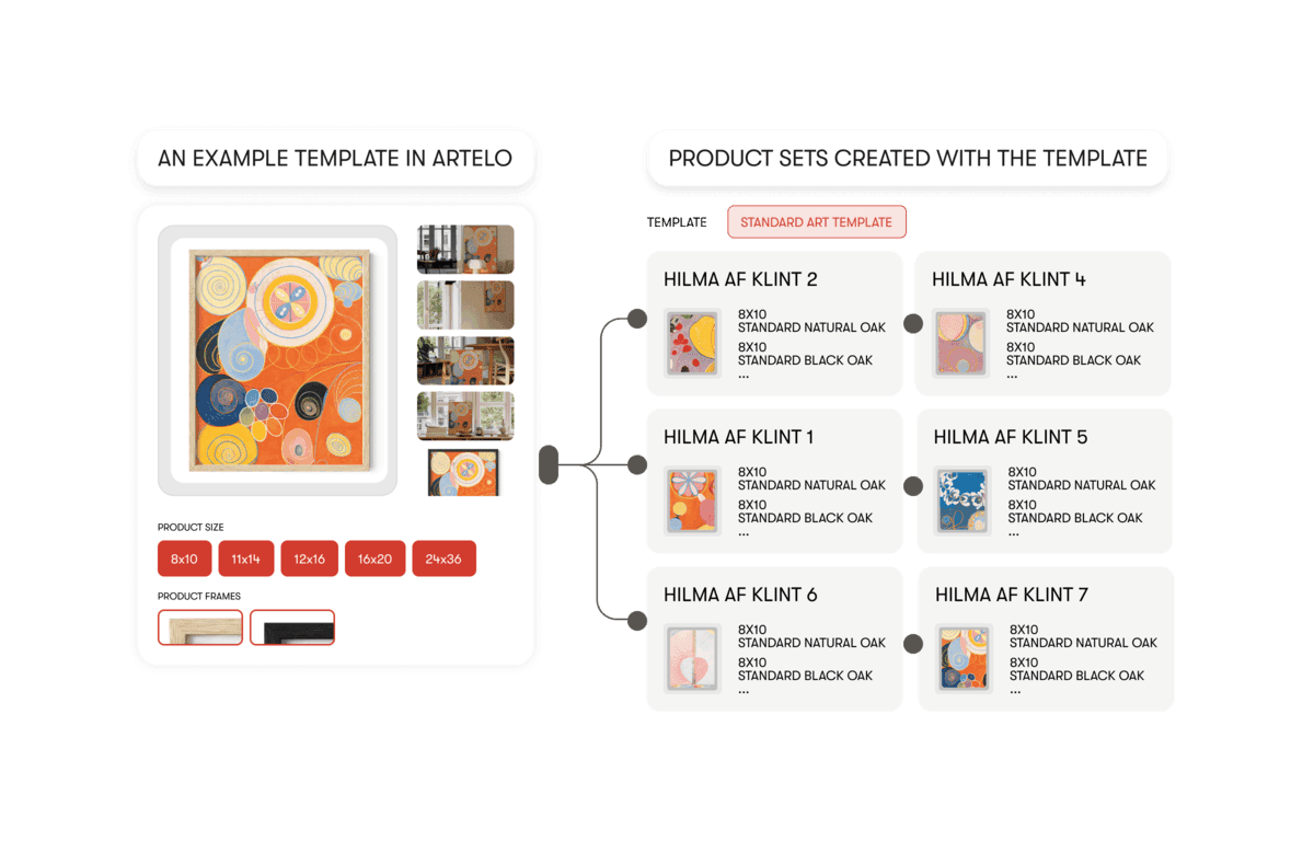 Templates let you save common product settings, such as sizes, frame styles, pricing, and shipping. Instead of starting from scratch every time, you can quickly apply a template to create new product sets with consistent options.
